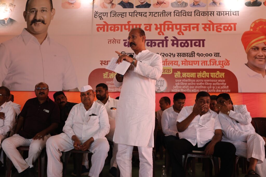 माजी आ.कुणाल पाटील यांनी पाठपुरावा करुन या कामांसाठी निधी मंजुर करुन आणला होता. त्यानंतर मोघण ता.धुळे येथे कार्यकर्ता मेळावा आयोजित करण्यात आला. यावेळी बोलतांना मा.आ.कुणाल पाटील यांनी सांगितले कि, पुढील पाच वर्ष विकास कामांचे लोकार्पण भूमीपूजन आणि उद्घाटन करता येईल एवढे विकासाची कामे आपण मंजुर करुन आणली आहेत. पांझरा आणि बोरी नदीवर पुलांची उभारणी करुन साखळी निर्माण केली.तालुक्यात रस्त्यांचे जाळे तयार केले. असंख्य विकासाची कामे प्रगतीपथावर आहेत.भविष्यकाळ उज्वल आहे. कोणत्याही कार्यकर्त्याने मागे हटू नये किंवा खचून जावू नये, धुळे तालुक्यात लोकनेते दाजीसाहेब रोहिदास पाटील यांनी उभी केलेली ताकद आहे. त्यामुळे कोणताही कार्यकर्ता कमजोर नाही, प्रत्येक जण काम करीत असतो. गोरगरीबांच्या मदतीसाठी धावून जात असतो. जि.प. आणि पं.स.निवडणूकीत सक्षम कार्यकर्त्याला उमेदवारी देवू, कोणत्याही कार्यकर्त्यावर अन्याय होणार नाही असे प्रतिपादन मा.आ.कुणाल पाटील यांनी यावेळी केले.